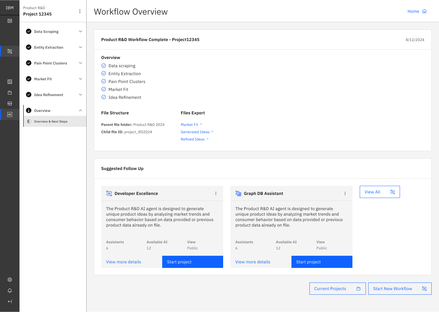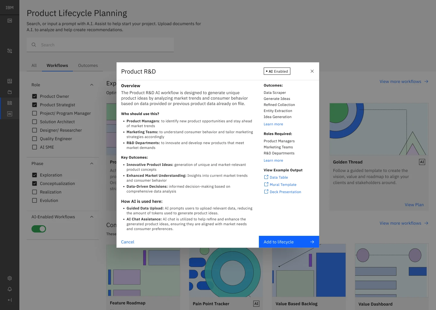 We created an initial dashboard. We needed a hub to allow for filtering and selection of all the different flows. Flows could be a product planning flow to a generative AI tool that would refine an idea for future product features. We also needed a way to specifically filter out A.I. enabled tools for companies that wouldn’t want to use this tool with them.