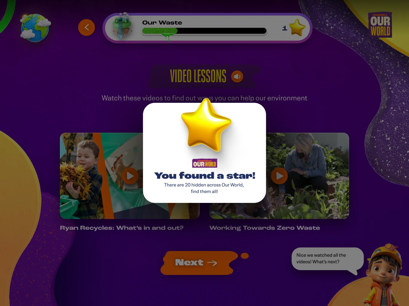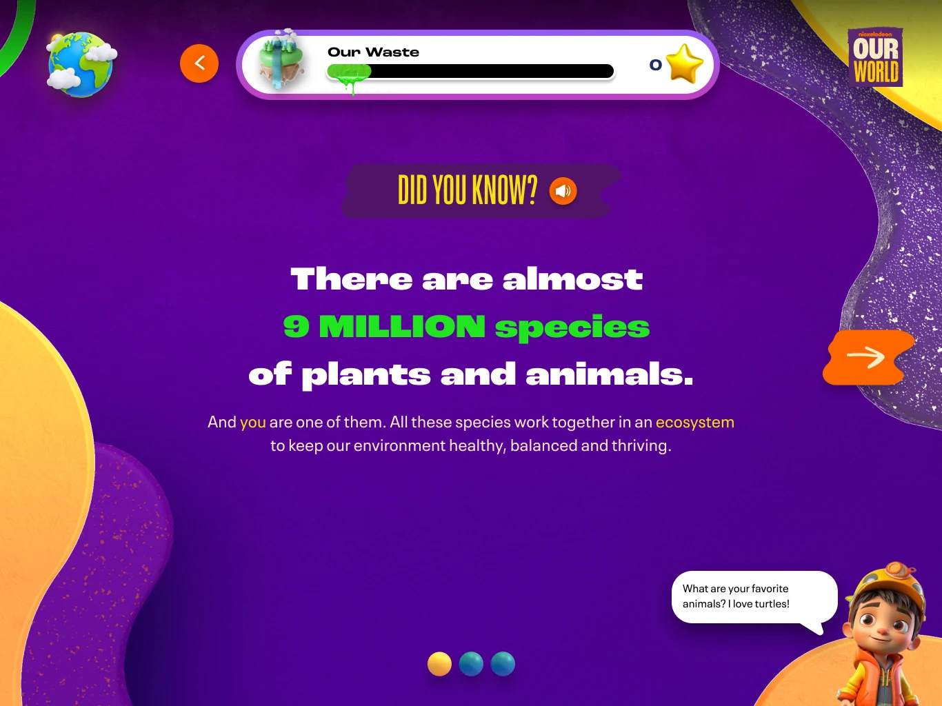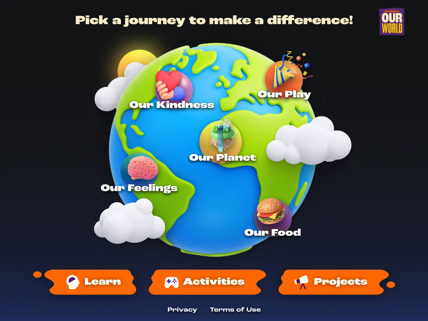 Nickelodeon came back with research stating that 2/3 of kids don’t believe they can make a difference in the world. It is our job to create an experience that can help educate and get kids to understand they can. Key topics to cover are food instability, global warming, mental health, and bullying. The experience needs to be fun, interactive, educational, COPPA compliant and accessible on all fronts. All of this needed to fall under the Our World umbrella at Nickelodeon.
